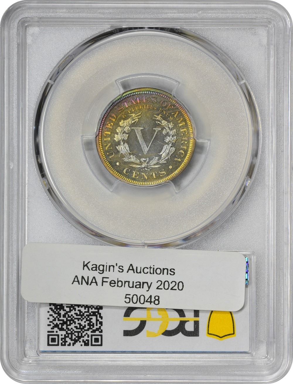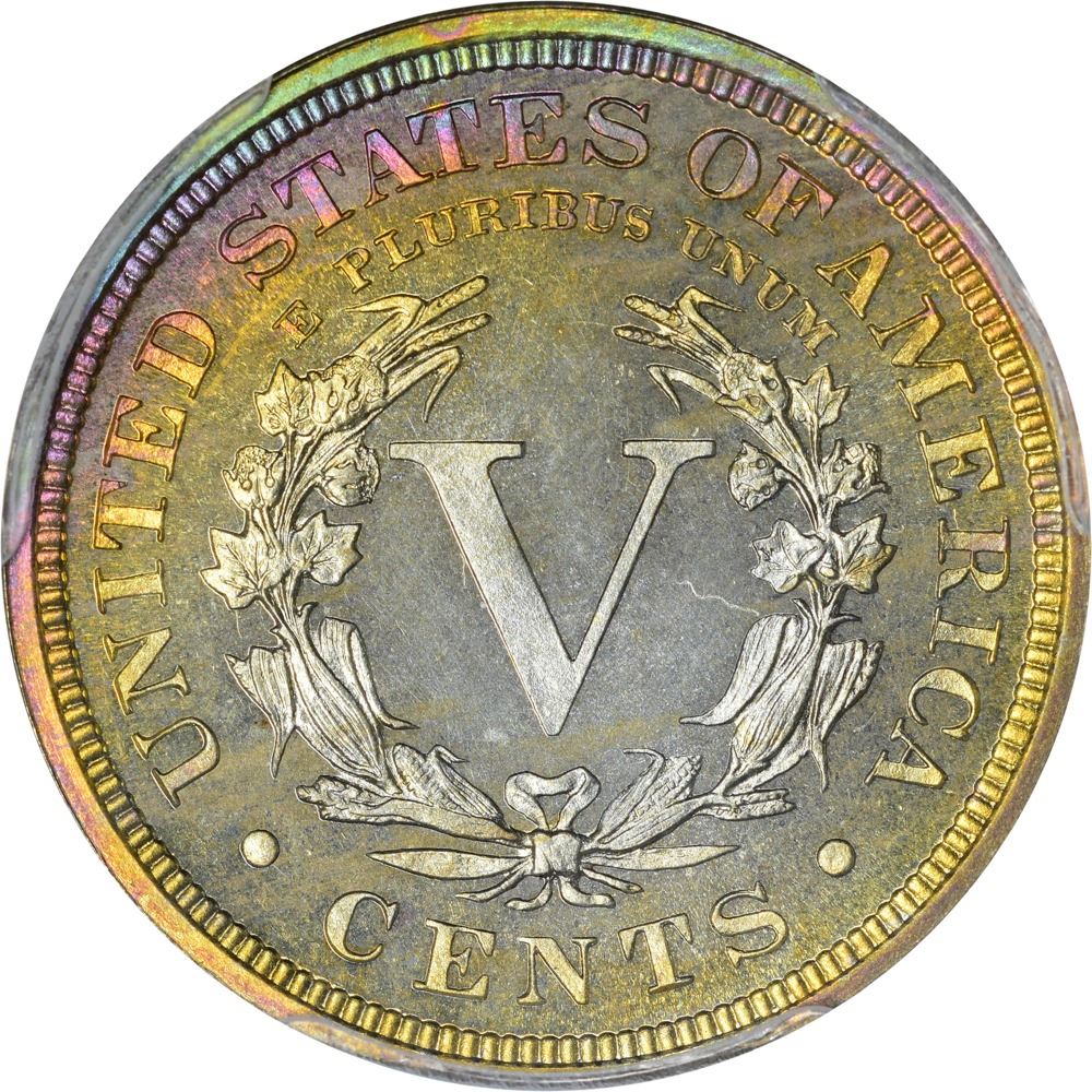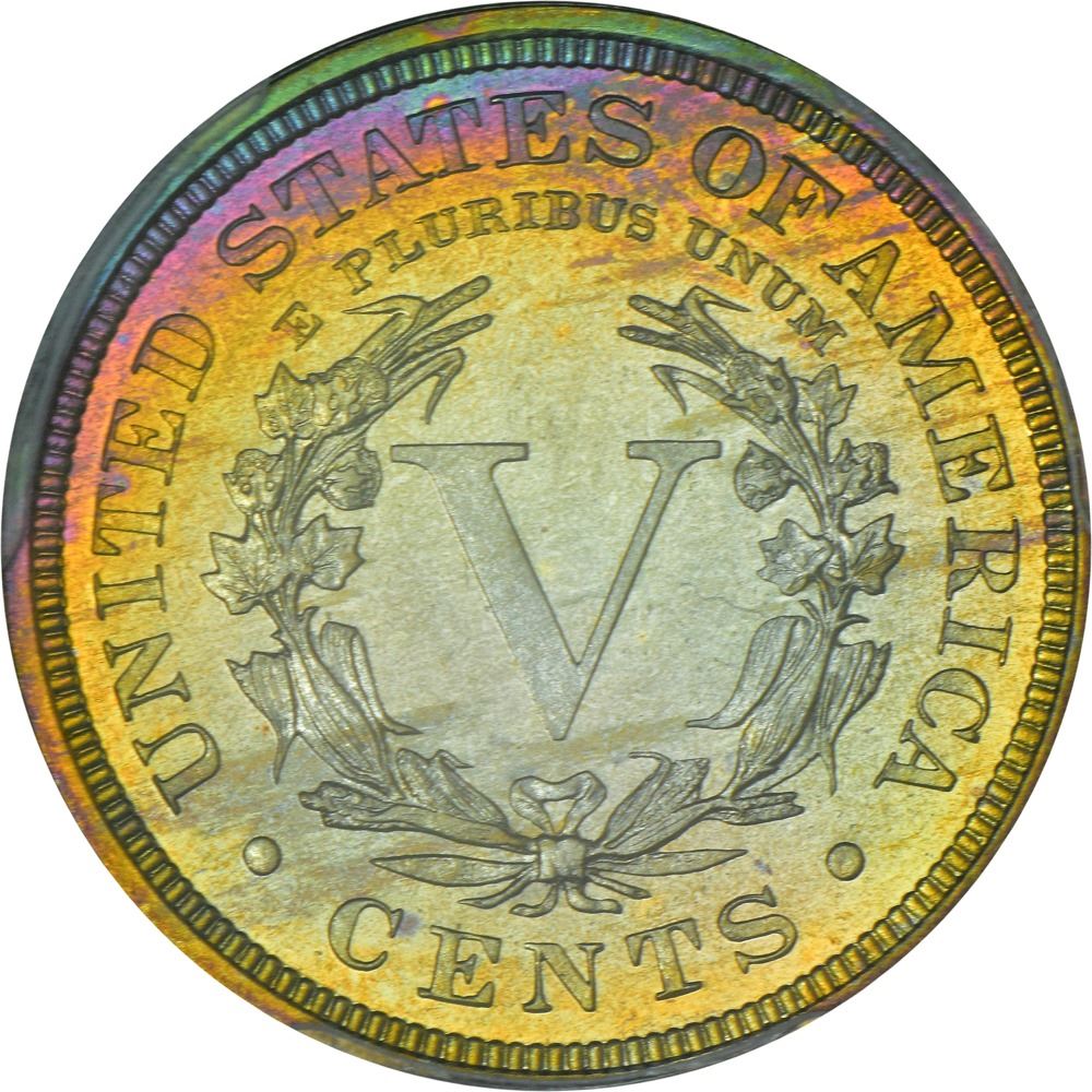 Even without a bold light source, this specimen has a lot to offer visually. Add in the glow of a desk lamp, and this beauty really springs to life. Name your favorite rainbow color and it’s here in one shade or another, all boldly and pleasantly arranged in an obverse toning crescent that ranges from star 13 clockwise and around from there to star 7 and then faintly to all the other stars. This colorful arrangement engages the date, the tip of Liberty’s neck, and the outer reaches of her profile at its widest point. The reverse sports an equally lovely crescent that is at its peak from 9 o’clock around to 3 o’clock. As pretty as the proverbial picture. One of just 13 Proofs of the date to receive a “+” designation from PCGS.