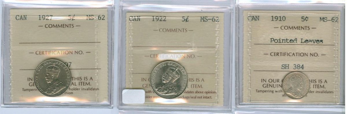 1910 Ptd Lvs, 1922 & 1927 5¢ ICCS MS62. Lot of 3 coins.