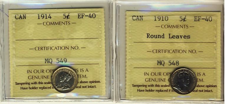 1910 RL & 1914 5¢ ICCS EF40. Lot of 2 coins.