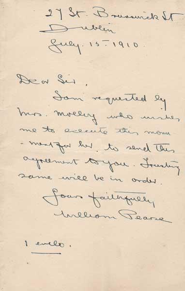 A rare signature and letter from William Pearse, brother of Padraig, dated the 15 July 1910 and sent from 27 Great Brunswick Street (now Pearse Street), home of the family business and birthplace of both brothers.