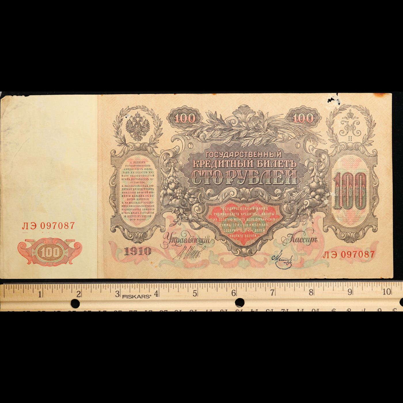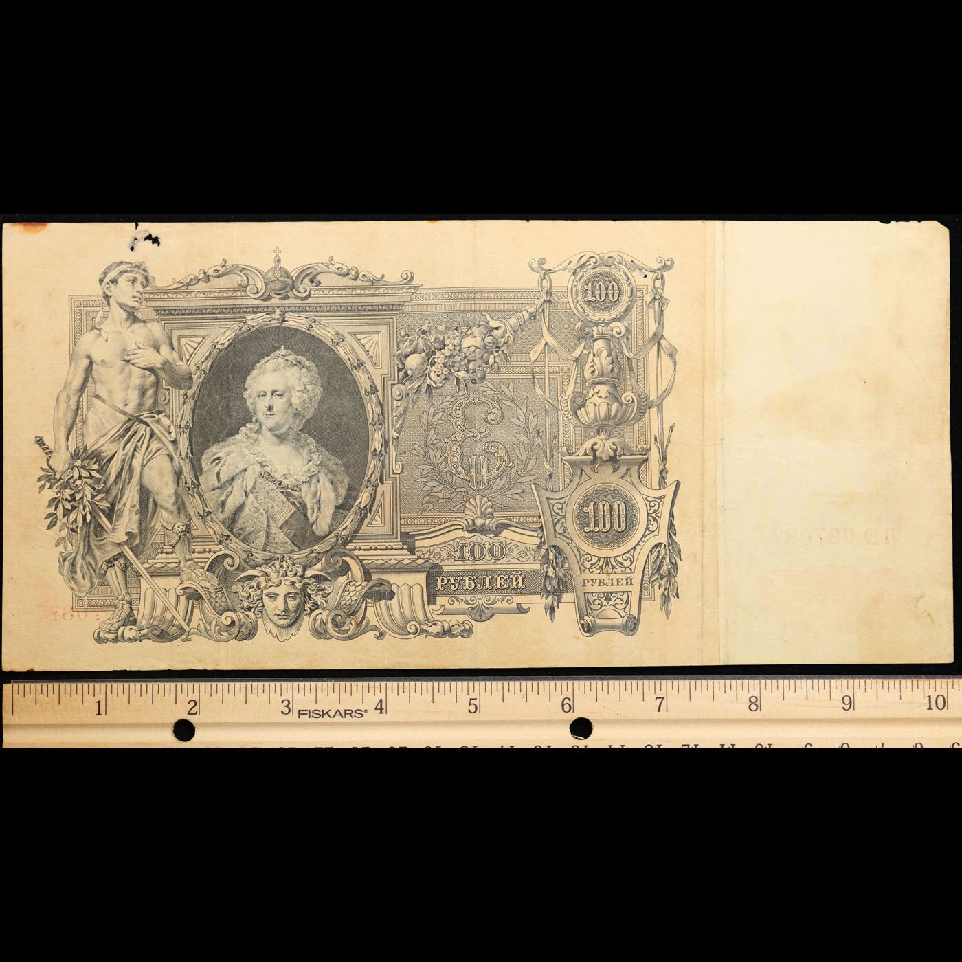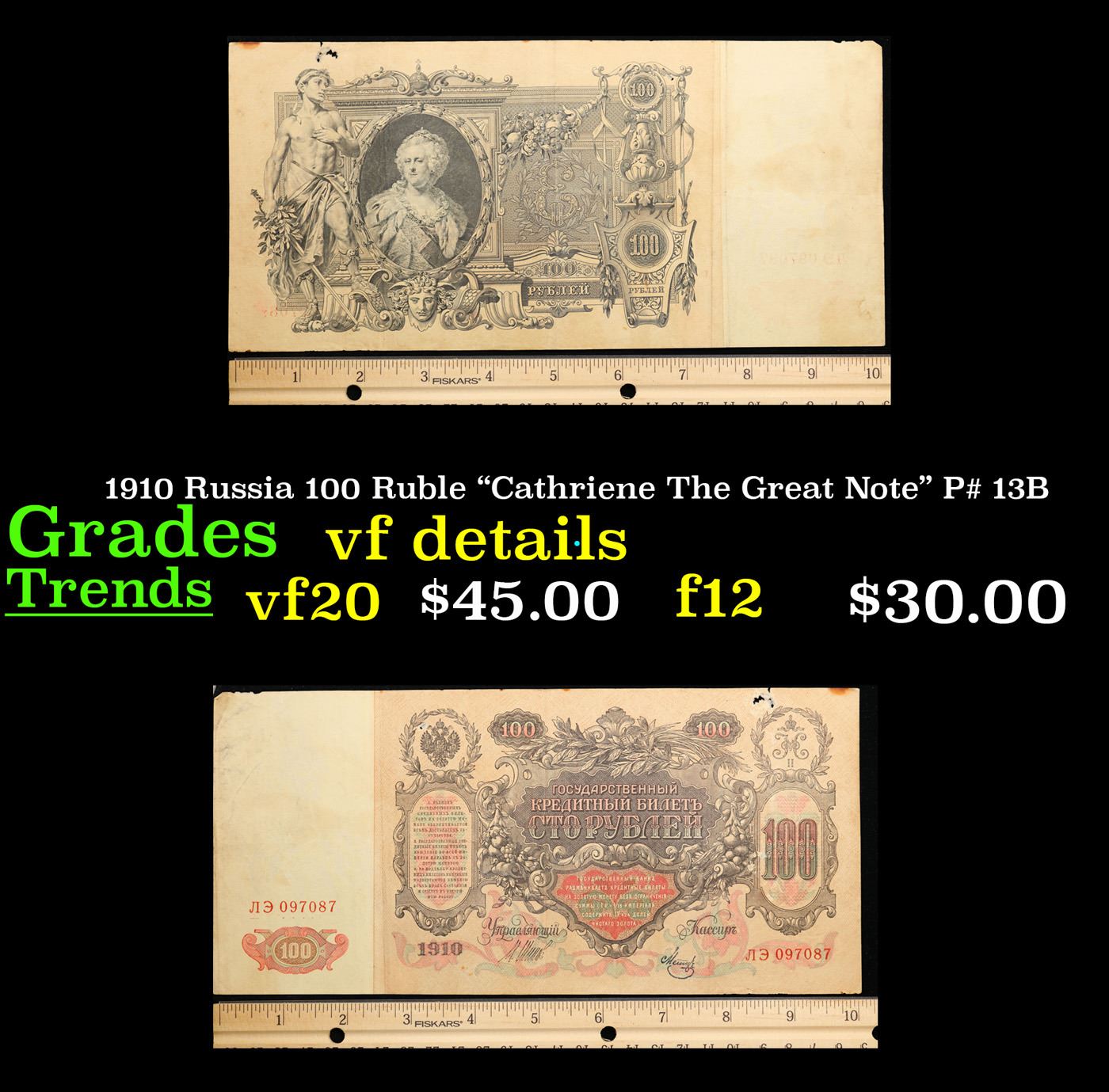 1910 Russia 100 Ruble "Cathriene The Great Note" P# 13B Grades vf details. The 1910 100 Ruble Note features a portrait and watermark of Tsarina Catherine the Great, as well as a young man with a sword and the coat of arms of the Russian Tsars. Additionally, it threatens counterfeiters with "the exclusion of all rights and one week hard labor".