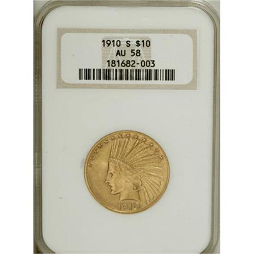 <B>1910-S $10 AU58 NGC.</B></I> NGC Census: (355/320). PCGS Population (174/374). Mintage: 811,000. Numismedia Wsl. Price for NGC/PCGS coin in AU58: $530. (#8867)<BR><BR><b>Shipping:</b> Coins & Currency (<a target="_blank" href="http://www.heritageauctions.com/common/shipping.php">view shipping information</a>)