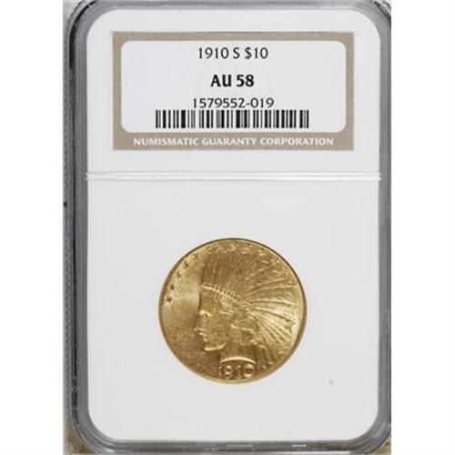 <B>1910-S $10 AU58 NGC.</B></I> . NGC Census: (382/339). PCGS Population (182/390). Mintage: 811,000. Numismedia Wsl. Price for NGC/PCGS coin in AU58: $575. (#8867)<BR><BR><B>Coin Engraver:</B> Augustus Saint-Gaudens<BR><BR><b>Shipping:</b> Coins & Currency (<a target="_blank" href="http://www.heritageauctions.com/common/shipping.php">view shipping information</a>)