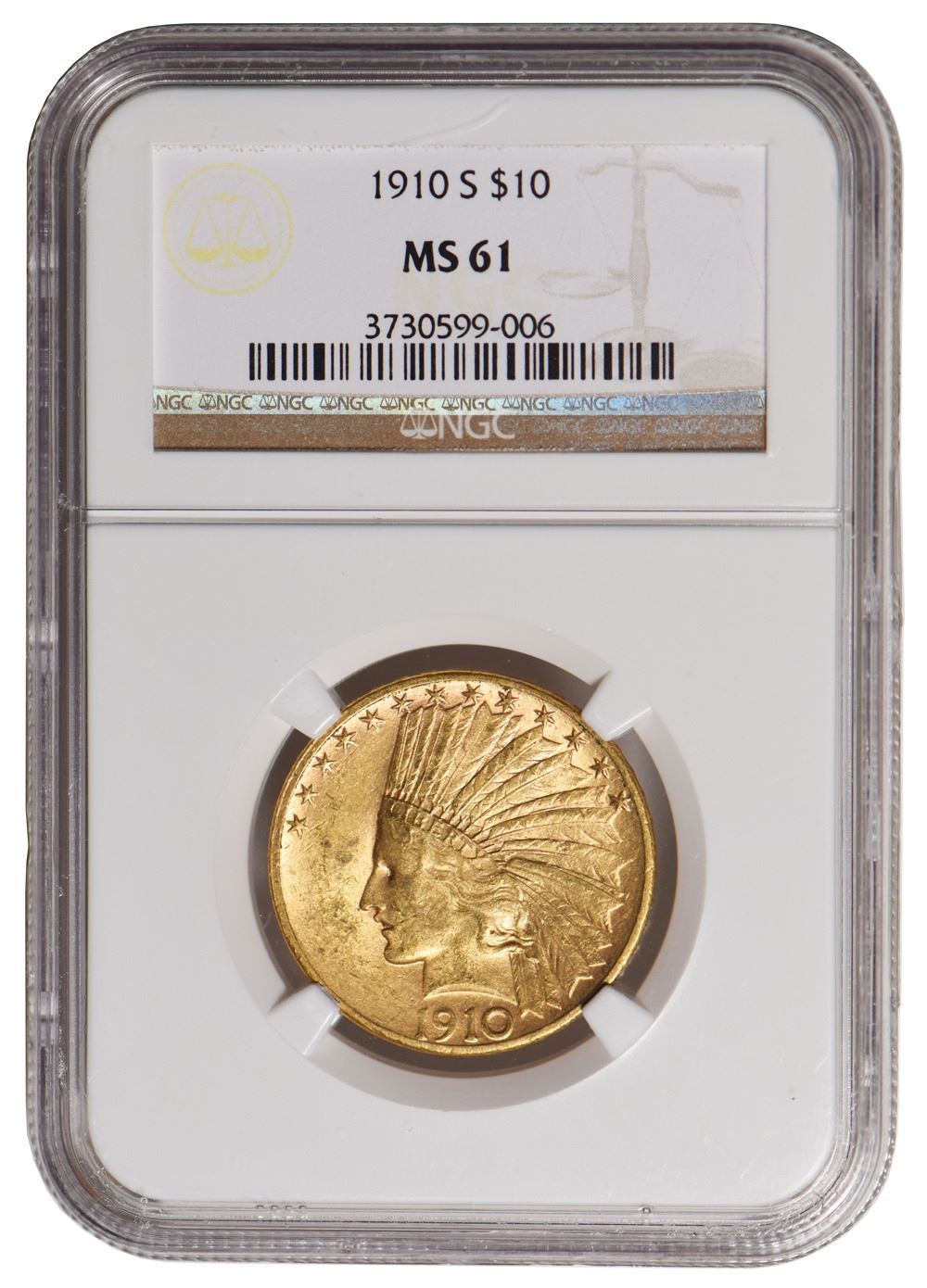 One 1910-S $10 Indian Head Eagle Gold Coin NGC MS61.
