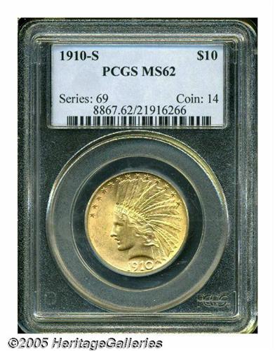 <B>1910-S<$10> MS62 PCGS.</B></I> Boldly struck, with pleasing rich luster, nice coloration, and a few grade-limiting contact marks, located mostly on the upper reverse. A scarce S-mint Indian eagle, and one that is unlikely to be seen in any grade of Mint State.