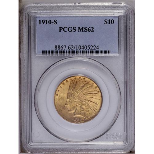 <B>1910-S<$10> MS62 PCGS.</B></I> The design elements are sharply struck, and honey-gold surfaces display soft luster. Several scuffs and ticks are scattered over both sides. <BR><BR><B>Important notice:</B> Heritage usually auctions material at the rate of 200-250 lots per hour. On some occasions eBay Live bid software or the Internet may not be able to keep up with the pace of the auction. We recommend placing a realistic absentee bid now as insurance to avoid disappointment. Occasionally the auctioneer may eliminate or reject an eBay Live bid, and the auctioneer may also reopen a lot after the close of the eBay live bidding (usually because we missed an audience bid), and may reject your bid even if it shows you as the winning bidder. By bidding via eBay Live, you agree that Heritage may award the lot to another bidder at its sole discretion under the circumstances described above or any other reasonable circumstances. Since eBay bids are not shown to us until we open the lot on the floor, we treat those bids just like floor bids. In most cases the floor responds before the eBay bid is presented to us, due to Internet lag time, so for consistency we have made it a policy that floor bids are always considered first over tie eBay live bids. Also please note that all Heritage lots purchased through eBay Live carry a 20% Buyer's Premium. Please make sure you read the Terms and Conditions before you bid. This lot is being auctioned in conjunction with a live floor auction by Heritage Galleries & Auctioneers. All final auction and invoice information will be supplied by Heritage Galleries & Auctioneers, and all other information should be considered preliminary. Lot:4126 <BR><BR><B>Winning Notification and Billing:</B> After the FINAL session in this auction is complete, Heritage will send e-mail and snail mail invoices. This process normally takes several days. All final auction and invoice information will be supplied by Heritage Galleries & Auctioneers, and all other information should be considered preliminary. <BR><BR>This auction will be conducted on a live auction floor and over the Internet through eBay Live. If you choose to place an absentee bid, please take a moment to <font color='#0000ff'><u><a href='http://pages.ebay.com/liveauctions/help/before/laabsentee.html'>learn how eBay Live absentee bidding works</a></u></font><font color='#000000'>