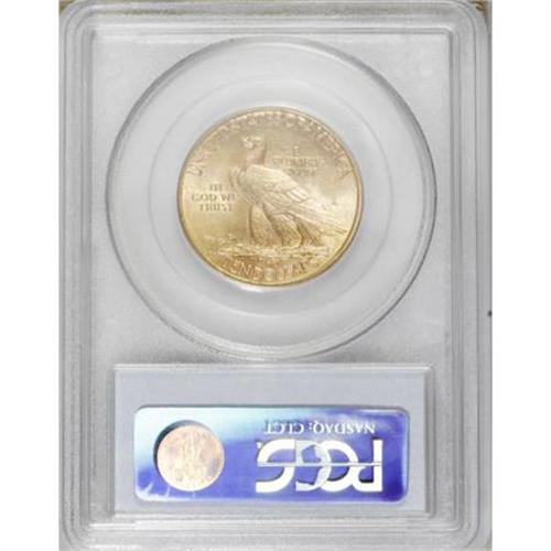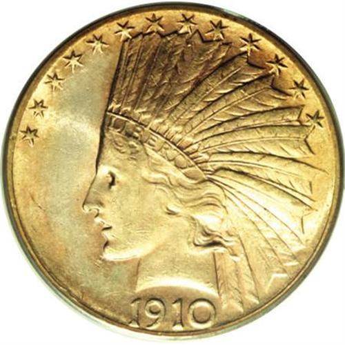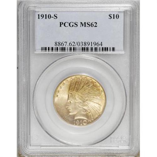 <B>1910-S $10 MS62 PCGS.</B></I> The 1910-S eagle follows the pattern of other S-Mint eagles of the period in that it is more common in circulated grades than in Mint State. This brings a good amount of collector demand to the relatively few Mint State examples that are available, and this piece will more than fit the demand of the date collector. Apricot gold surfaces combine with subtle bands of orange and blue color to bring a pleasant effect to the eye. Surface markings are in line with the assigned grade, yet do not unduly intrude.<BR><BR><B>Coin Engraver:</B> Augustus Saint-Gaudens<BR><BR><b>Shipping:</b> Coins & Currency (<a target="_blank" href="http://www.heritageauctions.com/common/shipping.php">view shipping information</a>)