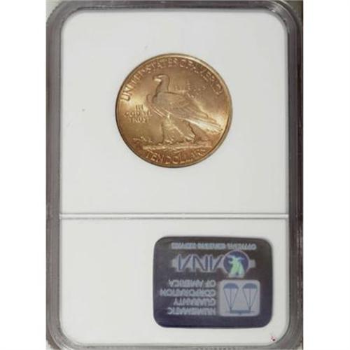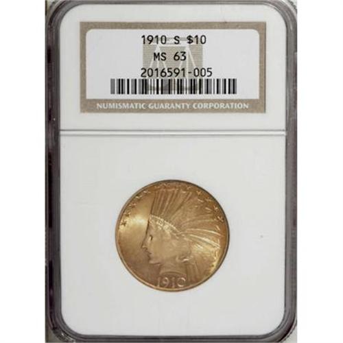 <B>1910-S $10 MS63 NGC.</B></I> A condition rarity in the Indian eagle series, one that despite its original high mintage was mostly obliterated in the wholesale gold meltings of the 1930s. Most survivors are well circulated, and few Mint State examples exceed MS63, the grade of the present example. This piece offers softly lustrous two-toned surfaces, with deep reddish-gold at the rims and yellow-gold centers. The strike is a bit soft on the highpoints of each side, and a couple of small ticks in those same areas contribute to the grade. However, this piece offers generous appeal and will not be easily replaced, either in terms of numerical grade or aesthetic appeal.<BR><BR><B>Coin Engraver:</B> Augustus Saint-Gaudens<BR><BR><b>Shipping:</b> Coins & Currency (<a target="_blank" href="http://www.heritageauctions.com/common/shipping.php">view shipping information</a>\)