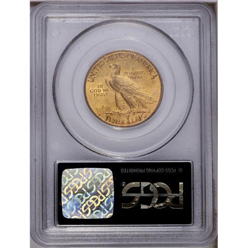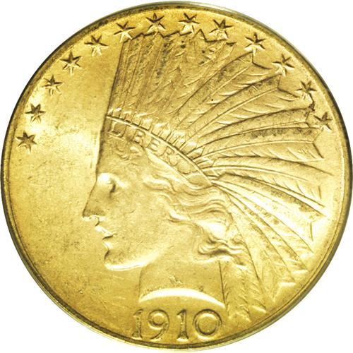 <B>1910-S<$10> MS63 PCGS.</B></I> Despite its high mintage (811,000 pieces), the 1910-S is a challenging coin in the Uncirculated grades of MS63 and finer, where fewer than 130 examples have been certified by PCGS and NGC. The present MS63 example exhibits soft, glowing luster and warm orange-gold color. The design elements are well brought up throughout. A few minute marks over each side limit the grade. Population: 71 in 63, 23 finer (4/06).