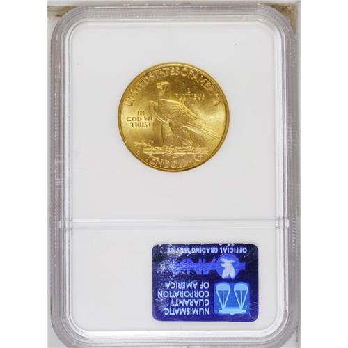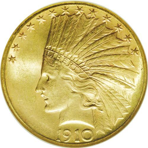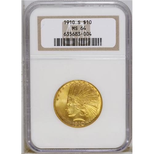 <B>1910-S $10 MS64 NGC.</B></I> The 1910-S eagle is one of the true condition rarities of the series: Gem and finer pieces of this issue number only eight specimens at both services, so this high-end near-Gem poses an especially attractive alternative. Luscious, deep orange-gold surfaces with coruscating luster are the hallmark of this elusive and important coin. The few light abrasions, mostly visible only under a loupe, are completely consistent with the near-Gem grade. Only a single tick is noted on the Indian's cheek, along with a small luster break on the reverse just above the motto. Extremely appealing! Census: 8 in 64, 4 finer (12/06).<BR><BR><b>Shipping:</b> Coin/Currency (<a target="_blank" href="http://www.heritageauctions.com/common/shipping.php">view shipping information</a>)