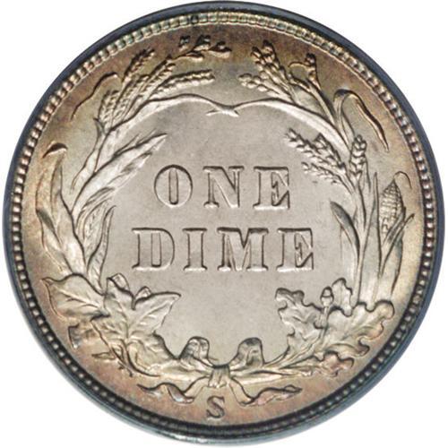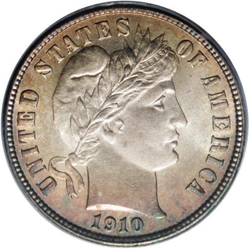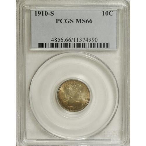<B>1910-S 10C MS66 PCGS.</B></I> Between the low mintage of 1.24 million pieces and the heightened commercial activity of San Francisco in the early 20th century, it is little surprise that this issue is a condition rarity at such a lofty level. Well-defined with vibrant luster beneath warm reddish-orange and plum peripheral toning that fades to golden-gray at the centers.<BR><BR><b>Shipping:</b> Coins & Currency (<a target="_blank" href="http://www.heritageauctions.com/common/shipping.php">view shipping information</a>)