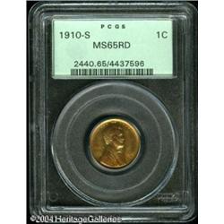 1910-S 1C MS65 Red PCGS. Marvelous original toning <B>1910-S 1C MS65 Red PCGS.</B></I> Marvelous original toning decorates the lustrous, blemish-free surfaces. Lime-green and apricot-red colors are the most prominent, on both the obverse and the reverse.<BR><I>From The Dennis Dewart Collection.</B></I> <BR><BR><B>Important notice:</B> Heritage usually auctions material at the rate of 200-250 lots per hour. On some occasions eBay Live bid software or the Internet may not be able to keep up with the pace of the auction. We recommend placing a realistic absentee bid now as insurance to avoid disappointment. Occasionally the auctioneer may eliminate or reject an eBay Live bid, and the auctioneer may also reopen a lot after the close of the eBay live bidding (usually because we missed an audience bid), and may reject your bid even if it shows you as the winning bidder. By bidding via eBay Live, you agree that Heritage may award the lot to another bidder at its sole discretion under the circumstances described above or any other reasonable circumstances. Since eBay bids are not shown to us until we open the lot on the floor, we treat those bids just like floor bids. In most cases the floor responds before the eBay bid is presented to us, due to Internet lag time, so for consistency we have made it a policy that floor bids are always considered first over tie eBay live bids. Also please note that all Heritage lots purchased through eBay Live carry a 20% Buyer's Premium. Please make sure you read the Terms and Conditions before you bid. This lot is being auctioned in conjunction with a live floor auction by Heritage Galleries & Auctioneers. All final auction and invoice information will be supplied by Heritage Galleries & Auctioneers, and all other information should be considered preliminary. Lot:5137
