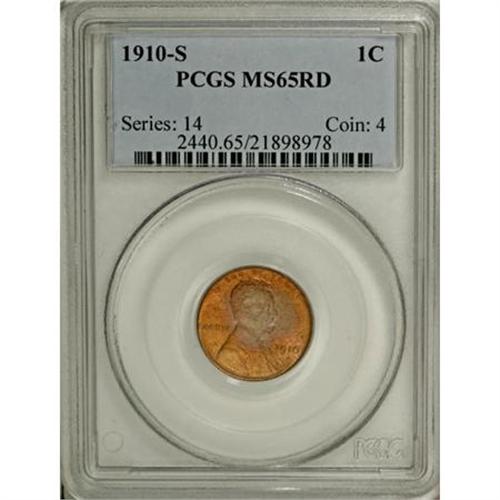 <B>1910-S 1C MS65 Red PCGS.</B></I> A beautifully made and seemingly pristine Gem, displaying copper-gold patina, imbued with rose and ice-blue in the centers. Radiant luster exudes from matte-like surfaces that exhibit sharply struck devices. <BR><BR><B>Coin Engraver:</B> Victor D. Brenner<BR><BR><b>Shipping:</b> Coins & Currency (<a target="_blank" href="http://www.heritageauctions.com/common/shipping.php">view shipping information</a>)