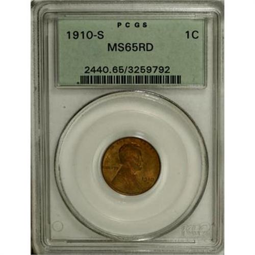 <B>1910-S 1C MS65 Red PCGS.</B></I> This low mintage Gem has unencumbered luster and a penetrating strike. Green-gold with glimpses of cherry-red. Mark-free and original with infrequent pinpoint flecks. Encapsulated in a green label holder.<BR><BR><B>Coin Engraver:</B> Victor D. Brenner<BR><BR><b>Shipping:</b> Coins & Currency (<a target="_blank" href="http://www.heritageauctions.com/common/shipping.php">view shipping information</a>)