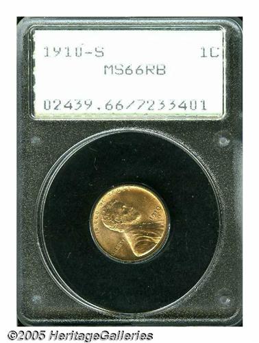 <B>1910-S<1C> MS66 Red and Brown PCGS.</B></I> The obverse of this well struck second year branch mint Cent appears full Red, while the reverse is evenly divided in gold and tan-brown colors. Unabraded and with little carbon. In a first generation holder.