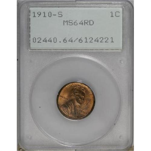 <B>1910-S 1C MS64 Red PCGS.</B></I> PCGS Population (311/337). NGC Census: (112/154). Mintage: 6,045,000. Numismedia Wsl. Price for NGC/PCGS coin in MS64: $260. (#2440)<BR><BR><B>Coin Engraver:</B> Victor D. Brenner<BR><BR><b>Shipping:</b> Coins & Currency (<a target="_blank" href="http://www.heritageauctions.com/common/shipping.php">view shipping information</a>)