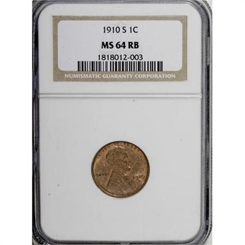 <B>1910-S 1C MS64 Red and Brown NGC.</B></I> NGC Census: (126/101). PCGS Population (283/129). Mintage: 6,045,000. Numismedia Wsl. Price for NGC/PCGS coin in MS64: $90. (#2439)<BR><BR><B>Coin Engraver:</B> Victor D. Brenner<BR><BR><b>Shipping:</b> Coins & Currency (<a target="_blank" href="http://www.heritageauctions.com/common/shipping.php">view shipping information</a>)