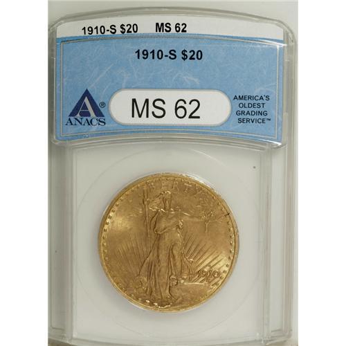 <B>1910-S $20 MS62 ANACS.</B></I> NGC Census: (1061/1464). PCGS Population (864/1728). Mintage: 2,128,250. Numismedia Wsl. Price for NGC/PCGS coin in MS62: $730. (#9156)<BR><BR><b>Shipping:</b> Coins & Currency (<a target="_blank" href="http://www.heritageauctions.com/common/shipping.php">view shipping information</a>)