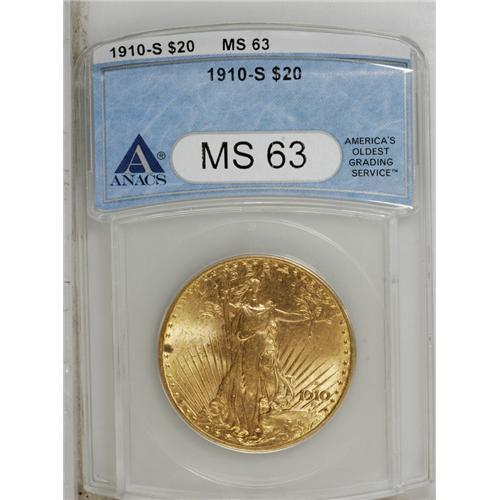 1910-S $20 MS63 ANACS. A well struck piece with pretty