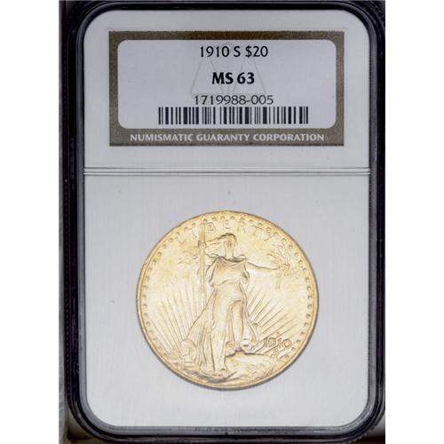 1910-S $20 MS63 NGC. The copper-gold surfaces have a f 1910-S[$20] MS63 NGC.