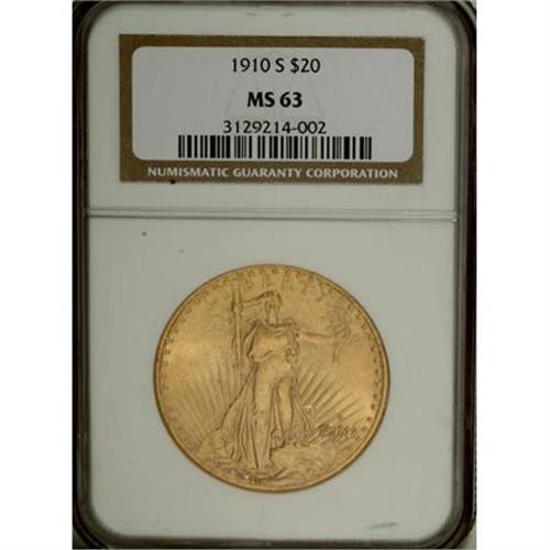<B>1910-S $20 MS63 NGC.</B></I> NGC Census: (942/588). PCGS Population (943/1102). Mintage: 2,128,250. Numismedia Wsl. Price for NGC/PCGS coin in MS63: $1,115. (#9156)<BR><BR><B>Coin Engraver:</B> Augustus Saint-Gaudens<BR><BR><b>Shipping:</b> Coins & Currency (<a target="_blank" href="http://www.heritageauctions.com/common/shipping.php">view shipping information</a>)