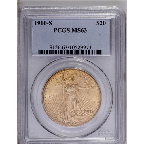 <B>1910-S<$20> MS63 PCGS.</B></I> A yellow-gold example with pale emerald patches in the fields. On the sharply struck devices are several abrasions, including a few on Liberty's chest.