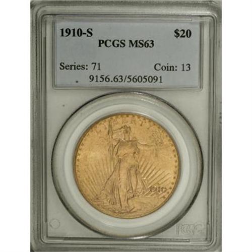 <B>1910-S $20 MS63 PCGS.</B></I> PCGS Population (943/1102). NGC Census: (942/588). Mintage: 2,128,250. Numismedia Wsl. Price for NGC/PCGS coin in MS63: $1,115. (#9156)<BR><BR><B>Coin Engraver:</B> Augustus Saint-Gaudens<BR><BR><b>Shipping:</b> Coins & Currency (<a target="_blank" href="http://www.heritageauctions.com/common/shipping.php">view shipping information</a>)