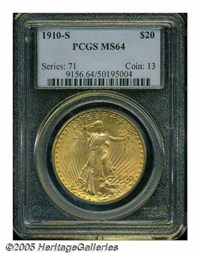 <B>1910-S<$20> MS64 PCGS.</B></I> A better-than-average strike for this condition rarity. Satiny and lustrous with fine, matte-like peach-gold surfaces, and normal marks for the grade. PCGS has graded 95 coins finer (6/05).