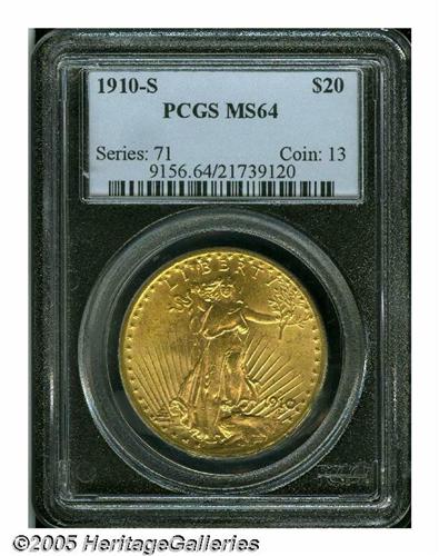 <B>1910-S<$20> MS64 PCGS.</B></I> A nice near-Gem example with vivid golden color and just some typical light wispy abrasions.