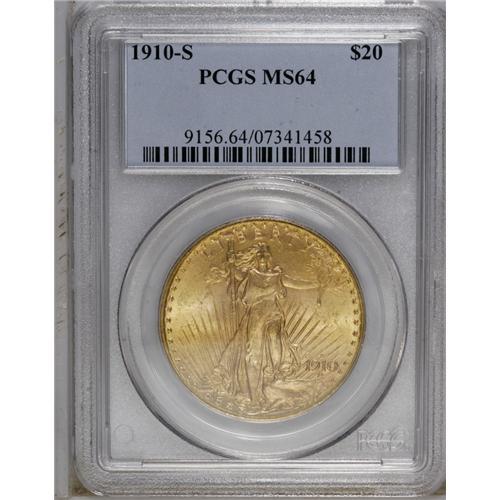 <B>1910-S<$20> MS64 PCGS.</B></I> A solidly struck yellow-orange double eagle that has pretty luster. Small, shallow marks in the fields keep this piece from a higher grade.