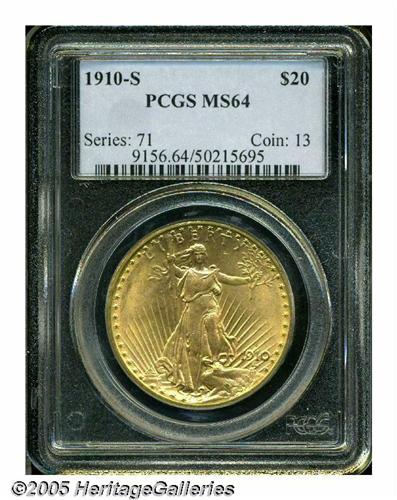 <B>1910-S<$20> MS64 PCGS.</B></I> A splendid and Choice Mint State example with frosty yellow luster. Excellent surfaces for the grade.