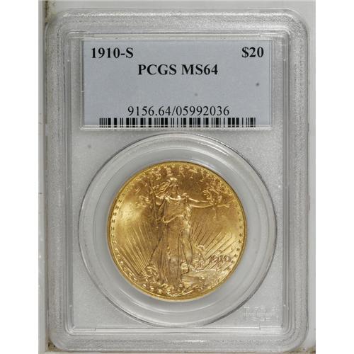 <B>1910-S $20 MS64 PCGS.</B></I> Rather remarkable and pleasing coloration is the hallmark of this highly lustrous near-Gem. The deep toning variations range from rose-gold to lime-green on the obverse, with steel-blue, apricot-orange, and salmon-red shadings noted on the reverse. A better early date in the Saint-Gaudens series.<BR><BR><b>Shipping:</b> Coin/Currency (<a target="_blank" href="http://www.heritageauctions.com/common/shipping.php">view shipping information</a>)