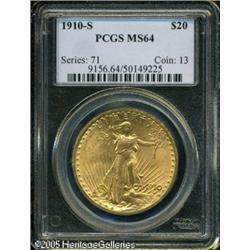 <B>1910-S $20 MS64 PCGS.</B></I> Sharply struck, with apricot-gold patina over lustrous surfaces, and a few minor marks consistent with the grade. Lot:9514