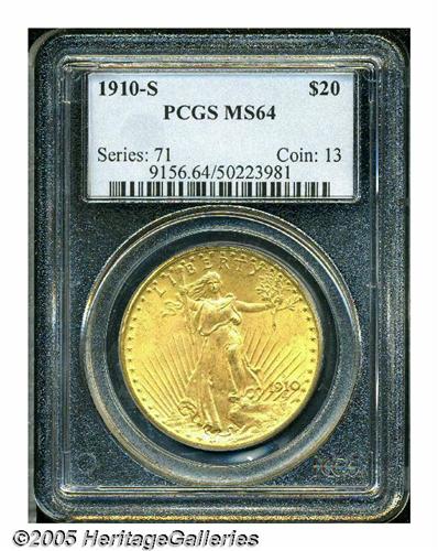 <B>1910-S<$20> MS64 PCGS.</B></I> The lustrous surfaces are bathed in honey-gold color, and exhibit sharply struck devices. A few light contact marks are scattered over each side, none of which are serious. The 1910-S is readily available through the MS64 grade level.