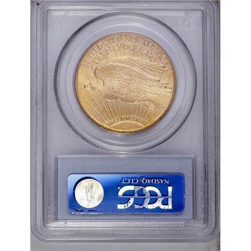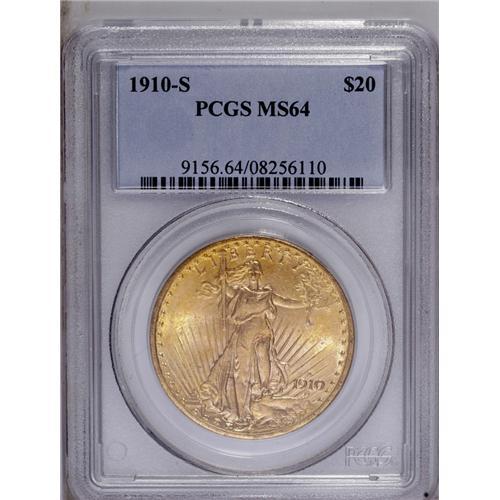 <B>1910-S<$20> MS64 PCGS.</B></I> This bright orange-gold example provides good luster and a crisp strike. Only a moderate mark on the thigh is worthy of mention. A transitional grade for the issue, which is costly as a full Gem.