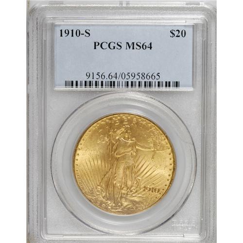 <B>1910-S $20 MS64 PCGS.</B></I> This precisely struck and satiny Choice Saint-Gaudens has clean fields and only a few small central marks. Khaki-gold and olive shadings ensure the charm.<BR><BR><b>Shipping:</b> Coins & Currency (<a target="_blank" href="http://www.heritageauctions.com/common/shipping.php">view shipping information</a>)