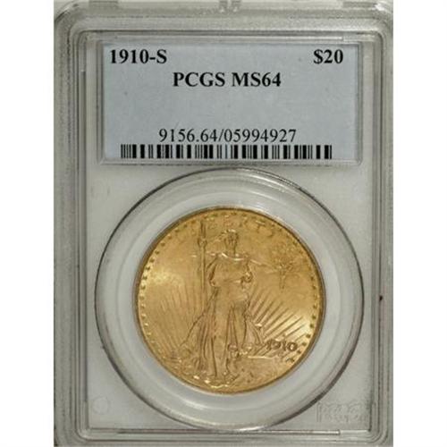 <B>1910-S $20 MS64 PCGS.</B></I> A radiantly lustrous near-Gem that exhibits boldly struck design elements. Apricot-gold surfaces reveal some minor grade-defining marks. Most of the 1910-S mintage was melted in the 1930s (Jeff Garrett and Ron Guth, 2006).<BR><BR><b>Shipping:</b> Coins & Currency (<a target="_blank" href="http://www.heritageauctions.com/common/shipping.php">view shipping information</a>)