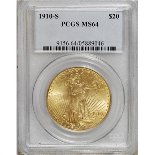 <B>1910-S $20 MS64 PCGS.</B></I> Solidly struck for this San Francisco Saint-Gaudens issue with satiny yellow-gold and sun-gold surfaces. Excellent eye appeal with surprisingly few marks for the grade.<BR><BR><B>Coin Engraver:</B> Augustus Saint-Gaudens<BR><BR><b>Shipping:</b> Coins & Currency (<a target="_blank" href="http://www.heritageauctions.com/common/shipping.php">view shipping information</a>)