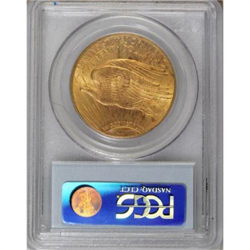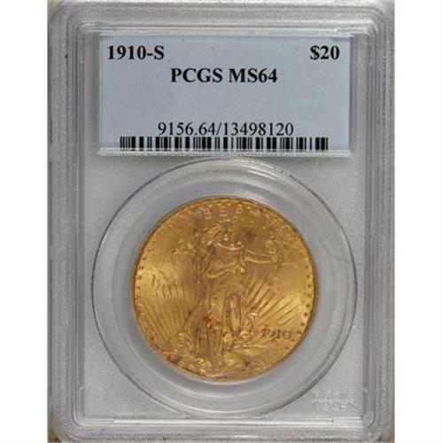 <B>1910-S $20 MS64 PCGS.</B></I> This coin displays frosty luster over the yellow-orange surfaces, but numerous small copper spots appear on the surfaces, the result of improper mixing of the gold alloy. An attractive piece despite the minor drawbacks.<BR><BR><B>Coin Engraver:</B> Augustus Saint-Gaudens<BR><BR><b>Shipping:</b> Coins & Currency (<a target="_blank" href="http://www.heritageauctions.com/common/shipping.php">view shipping information</a>)