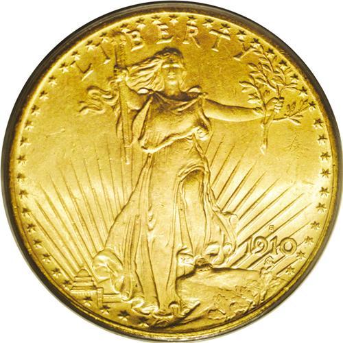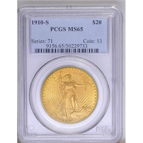 <B>1910-S<$20> MS65 PCGS.</B></I> A pretty example with slightly subdued luster on the satiny mustard-orange surfaces. Intricately detailed with an appreciable lack of marks; with slightly more vibrant luster, this coin could be a higher grade. PCGS has certified only 13 finer examples (7/06).