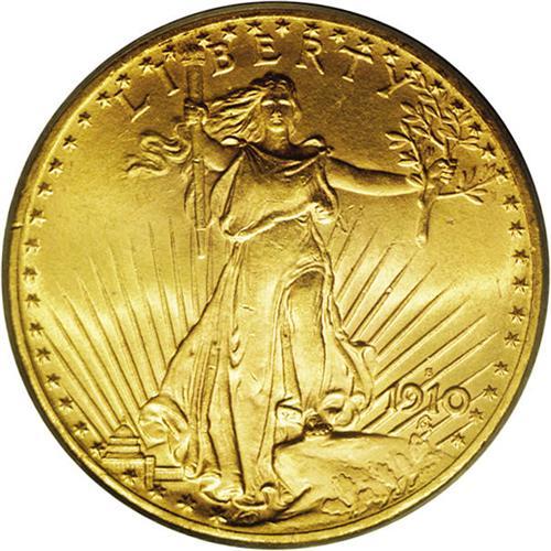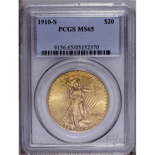 <B>1910-S<$20> MS65 PCGS.</B></I> Despite the considerable mintage in excess of 2 million pieces, the 1910-S is widely available in the lower Uncirculated grades, and quite elusive in Gem condition. When it <I>is</B></I> found, however, its quality is extremely pleasing and attractive. This example scores on all counts, with beaming, brilliant luster, pretty copper-gold surfaces, and a crisp strike. PCGS has graded 13 pieces finer (3/06). <BR><BR><B>Important notice:</B> Heritage usually auctions material at the rate of 200-250 lots per hour. On some occasions eBay Live bid software or the Internet may not be able to keep up with the pace of the auction. We recommend placing a realistic absentee bid now as insurance to avoid disappointment. Occasionally the auctioneer may eliminate or reject an eBay Live bid, and the auctioneer may also reopen a lot after the close of the eBay live bidding (usually because we missed an audience bid), and may reject your bid even if it shows you as the winning bidder. By bidding via eBay Live, you agree that Heritage may award the lot to another bidder at its sole discretion under the circumstances described above or any other reasonable circumstances. Since eBay bids are not shown to us until we open the lot on the floor, we treat those bids just like floor bids. In most cases the floor responds before the eBay bid is presented to us, due to Internet lag time, so for consistency we have made it a policy that floor bids are always considered first over tie eBay live bids. Also please note that all Heritage lots purchased through eBay Live carry a 20% Buyer's Premium. Please make sure you read the Terms and Conditions before you bid. This lot is being auctioned in conjunction with a live floor auction by Heritage Galleries & Auctioneers. All final auction and invoice information will be supplied by Heritage Galleries & Auctioneers, and all other information should be considered preliminary. Lot:4604 <BR><BR><B>Winning Notification and Billing:</B> After the FINAL session in this auction is complete, Heritage will send e-mail and snail mail invoices. This process normally takes several days. All final auction and invoice information will be supplied by Heritage Galleries & Auctioneers, and all other information should be considered preliminary. <BR><BR>This auction will be conducted on a live auction floor and over the Internet through eBay Live. If you choose to place an absentee bid, please take a moment to <font color='#0000ff'><u><a href='http://pages.ebay.com/liveauctions/help/before/laabsentee.html'>learn how eBay Live absentee bidding works</a></u></font><font color='#000000'>