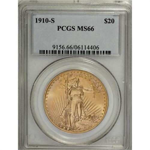 <B>1910-S $20 MS66 PCGS.</B></I> The 1910-S is another early Saint-Gaudens issue that is generally quite well produced, usually with lustrous, mattelike surfaces and a bold strike. More than 2.1 million pieces were produced in 1910, and likely quite a few of them were put up in storage. either in the United States or abroad. Like so many early issues, however, the vast majority of Mint State survivors fall into a range from about MS62 to Choice Uncirculated (MS64), with relatively few seen finer. Gems are available for a price, but in MS66 grade this coin is one of seven so certified at PCGS, which has also graded seven Superb Gems and one MS68 example of this issue (3/08)!<BR> Coruscating luster emanates from both sides of this stunning and boldly struck Premium Gem coin, with apricot-gold centers and a glint of hazel-gray along the obverse rim.<BR><BR><B>Coin Engraver:</B> Augustus Saint-Gaudens<BR><BR><b>Shipping:</b> Coins & Currency (<a target="_blank" href="http://www.heritageauctions.com/common/shipping.php">view shipping information</a>)