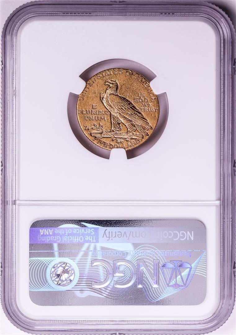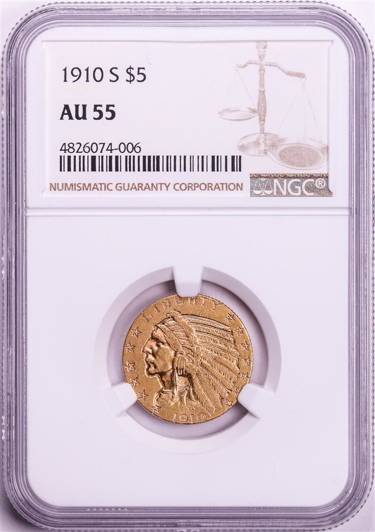 One 1910-S $5 Indian Head Half Eagle Gold Coin NGC AU55. NGC Certified.