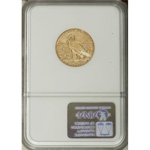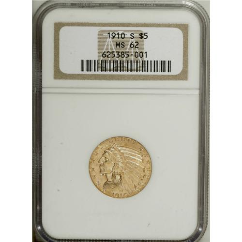 <B>1910-S $5 MS62 NGC.</B></I> This exceptionally well struck S-Mint displays lustrous peach-gold surfaces. Light handling marks are noted in the raised, exposed fields, particularly on the upper reverse. Census: 44 in 62, 25 finer (11/06).<BR><BR><b>Shipping:</b> Coin/Currency (<a target="_blank" href="http://www.heritageauctions.com/common/shipping.php">view shipping information</a>)