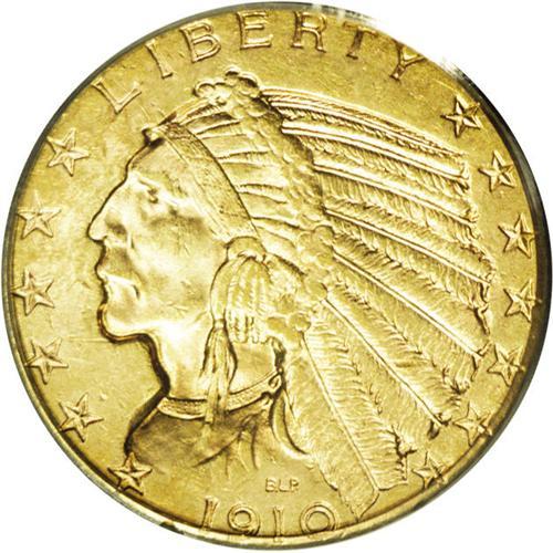 <B>1910-S<$5> MS62 PCGS.</B></I> Boldly struck (except for the mintmark) and lustrous, with rich coloration and a typical number of small abrasions for the assigned grade level. The mintmark is very mushy, and a pair of small, faint alloy spots are noted in the upper left reverse field. A conditionally scarce Indian half eagle of San Francisco origin. Population: 51 in 62, 28 finer (2/06).