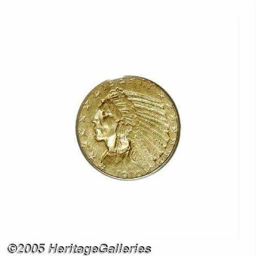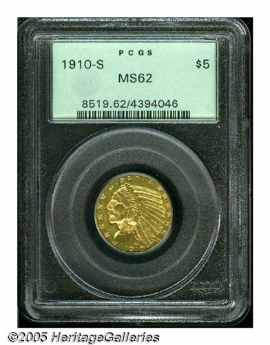<B>1910-S<$5> MS62 PCGS.</B></I> The series of Indian Half Eagles has several hidden rarities, coins that are under the radar of all but the most advanced specialists. This is one of those issues, with a mintage of 770,200 coins, nearly all which entered circulation. The typical survivor is apt to be Very Fine, or XF at best. AU coins are rare, and Mint State examples seldom encountered. Although some central weakness is apparent, this is a fully lustrous and highly attractive example. Just a few tiny blemishes, especially on the reverse, limit the grade. Population: 43 in 62, 28 finer (5/05).