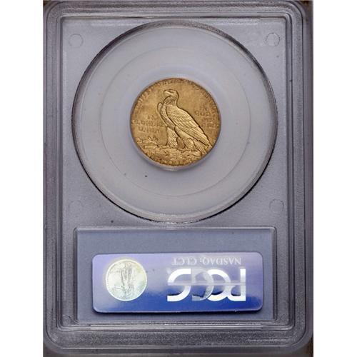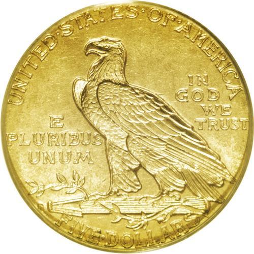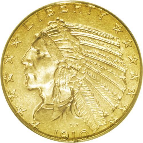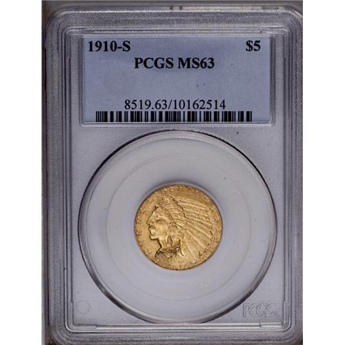 <B>1910-S<$5> MS63 PCGS.</B></I> A high-end piece in terms of eye appeal, with beautiful amber-gold surfaces, crisp satiny luster, and a modicum of small abrasions. The strike is quite well executed, and the Indian's cheek is noteworthy for its lack of abrasions. Save for a single small abrasion beneath the Indian's chin, most of the light contact marks are confined to the reverse. Population: 13 in 63, 19 finer (6/06).