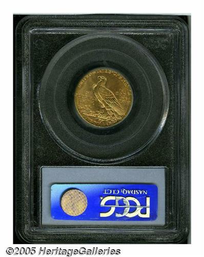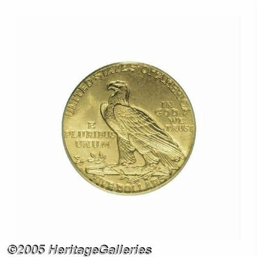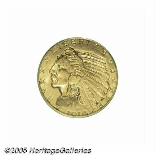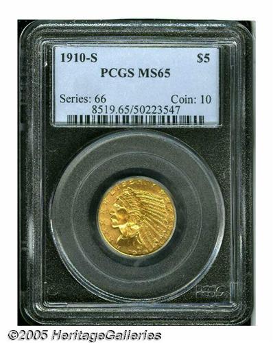 <B>1910-S<$5> MS65 PCGS.</B></I> An exceptionally elusive Five Dollar Indian in Gem condition, David Akers estimates that there may be as many as ten MS65 or better pieces known--a number that requires great patience on the part of a collector who wishes to acquire one of these seldom-offered rarities. Current population figures contradict this however, as only six Gems have seen either service.<BR> Easily the most visually arresting feature of this coin is its soft, frosted mint luster. It gently rolls around the surfaces as the coin is tilted beneath a light and shimmers beneath an even layer of coppery-gold and orange patina that covers both sides. Abrasions are so few that they could almost be individually listed. The only ones, however, that might be used for future identification purposes are a small cluster in the left obverse field just left of the Indian's nose. Also fully struck in all areas, and quite unusual as such, as most 1910-S fives are weakly defined. Population: 3 in 65, 1 finer (6/05).
