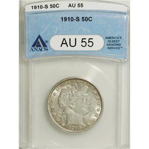 <B>1910-S 50C AU55 ANACS.</B></I> NGC Census: (0/44). PCGS Population (6/66). Mintage: 1,948,000. Numismedia Wsl. Price for NGC/PCGS coin in AU55: $425. (#6520)<BR><BR><b>Shipping:</b> Coins & Currency (<a target="_blank" href="http://www.heritageauctions.com/common/shipping.php">view shipping information</a>)