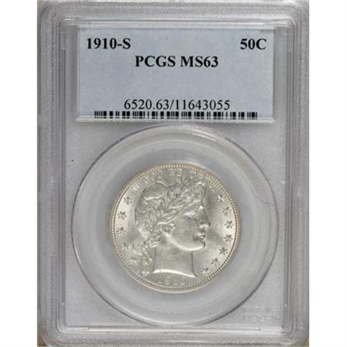 <B>1910-S 50C MS63 PCGS.</B></I> David Lawrence (1991) writes that the 1910-S half dollar is "common in low grades, but surprisingly tough in AU55 and above." The Select specimen offered in this lot exhibits pleasing luster that issues from untoned surfaces. Sharp definition is apparent on the design elements. Light obverse handling marks limit the grade. Population: 4 in 63, 38 finer (4/07).<BR><BR><b>Shipping:</b> Coins & Currency (<a target="_blank" href="http://www.heritageauctions.com/common/shipping.php">view shipping information</a>)